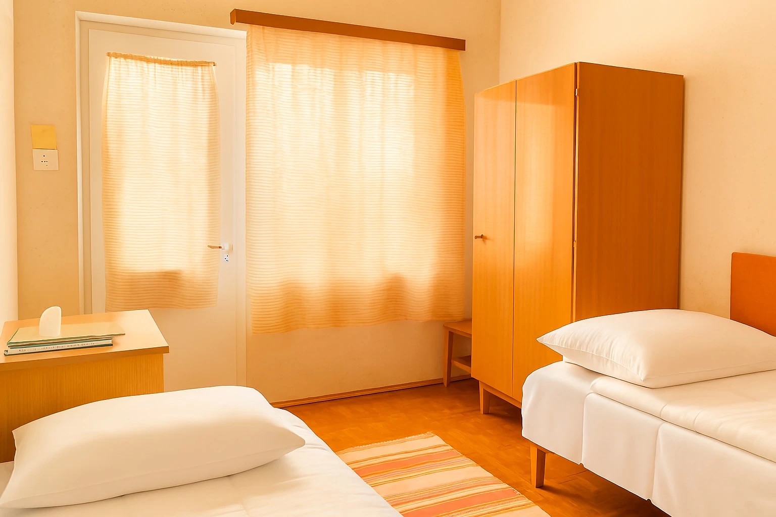 The accommodation, reminiscent of the ’70s–’80s retro style but carefully maintained, offers comfortable lodging for couples and small families. There are a total of 10 beds for 5+5 guests, in single (extra-bed capable) rooms.