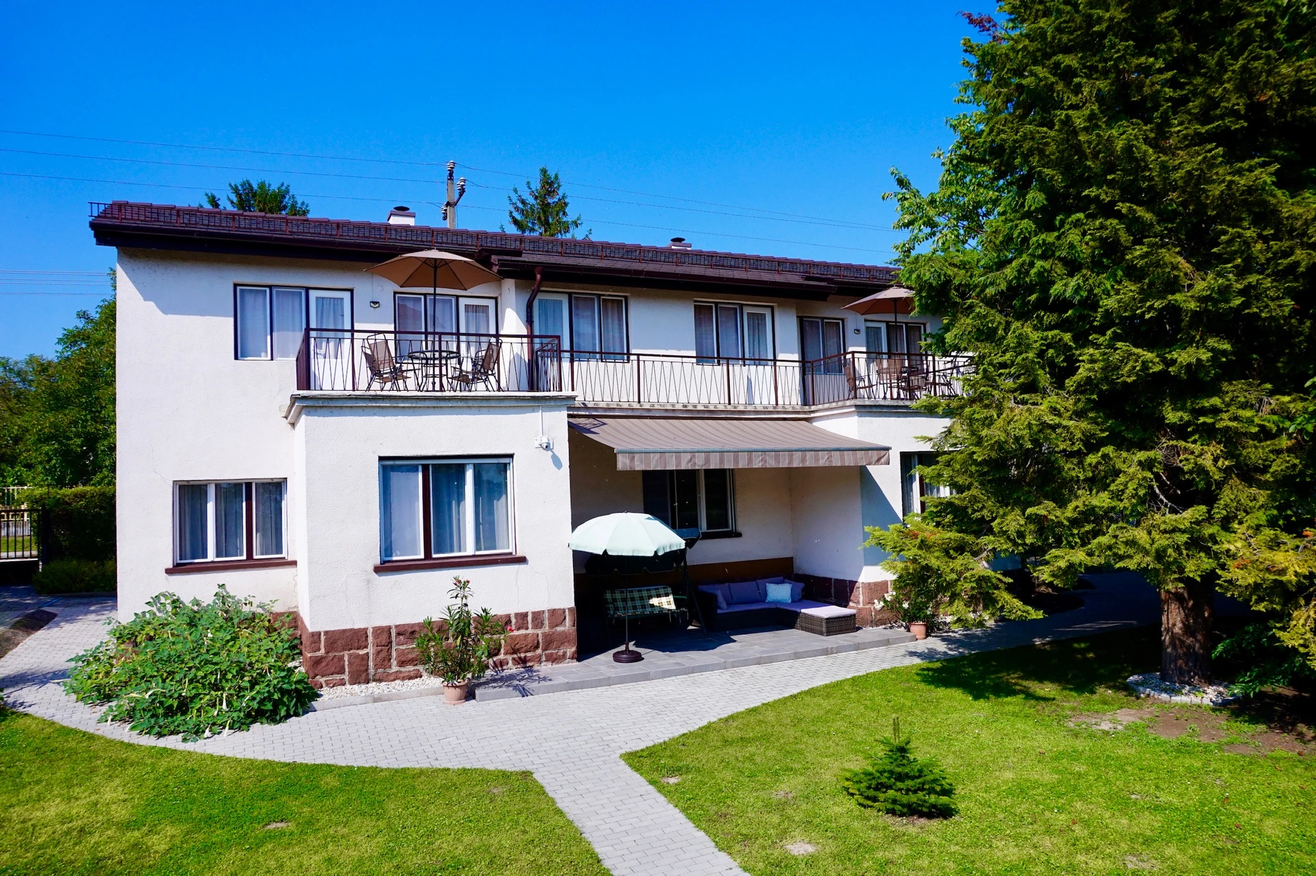 This room is located at the western end, providing a warm, sun-filled atmosphere throughout the day. Its spacious interior is an ideal choice for guests staying longer or simply those who enjoy a comfortable, airy layout. Direct terrace access allows guests to enjoy an evening family dinner or a friendly wine tasting featuring local Csopak wines, while the distant shimmering lights of Lake Balaton complete the experience.